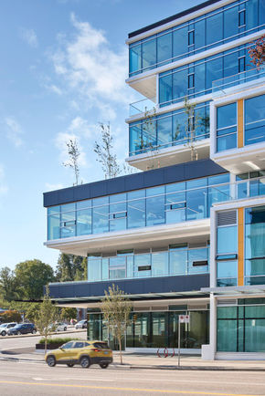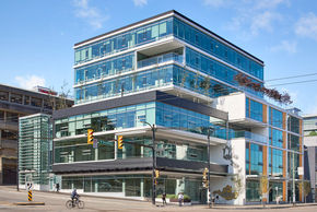 This 7-storey office building is located at the intersection of Cambie Street and Broadway, across the street from the Canada Line City Hall station.